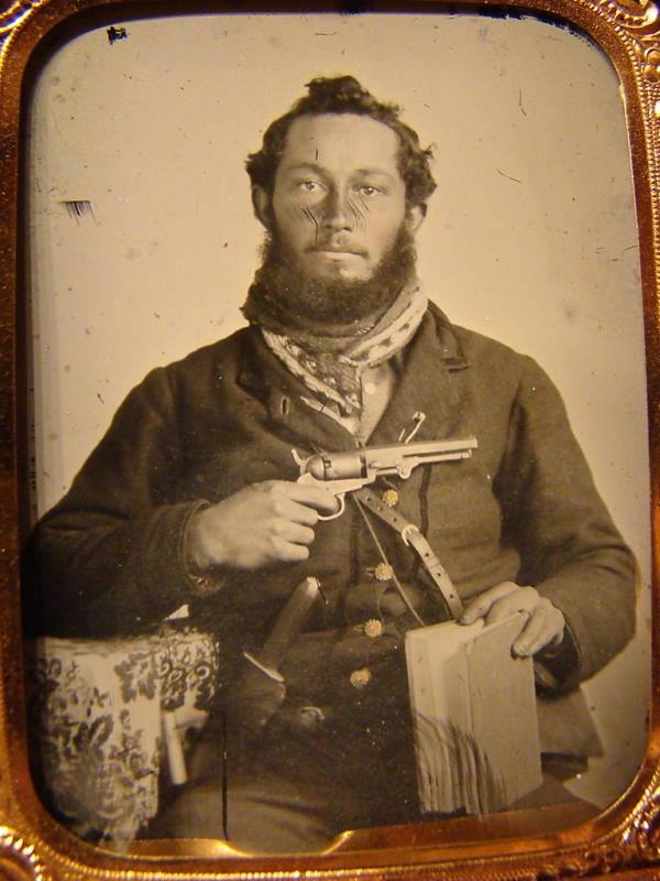 Un soldat exhibe fièrement un Colt mod 1849 Pocket
